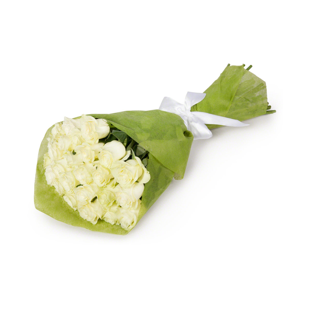 Элегантный букет из белоснежных роз в благородной фетровой упаковке — воплощение чистоты и божественной гармонии.