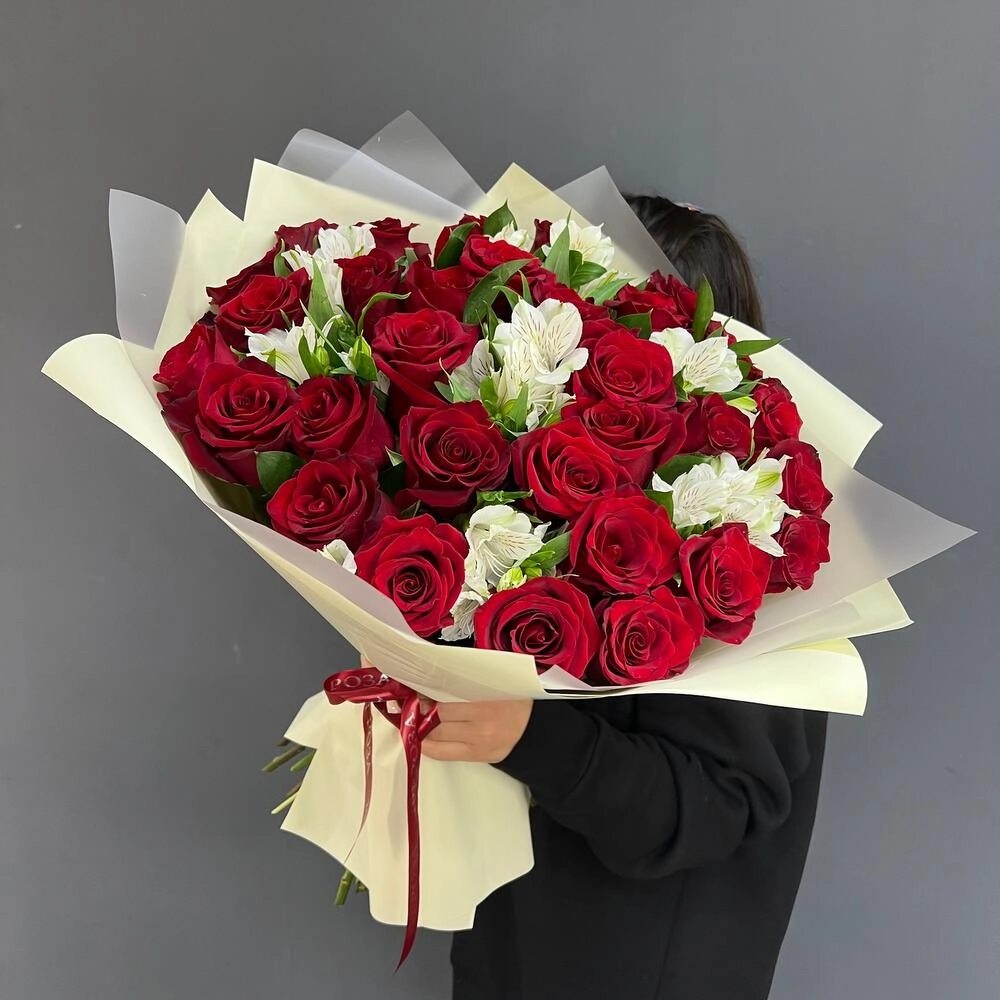 Волнующая композиция из алых роз и белоснежных альстромерий — воплощение совершенной любви. Идеальный выбор для романтического признания или годовщины отношений. Заказать букет цветов с доставкой в Вытегре.