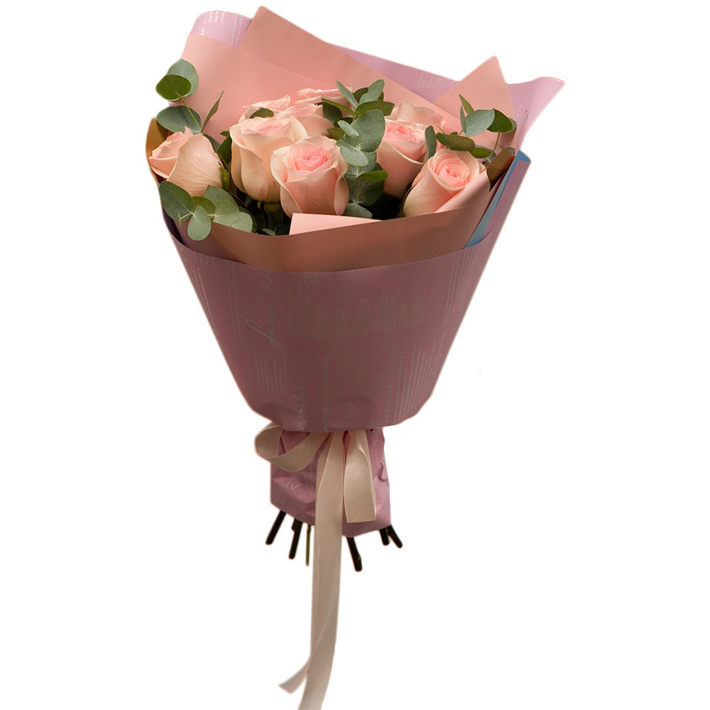 Изысканный букет из 9 нежно-розовых роз в обрамлении свежего эвкалипта.