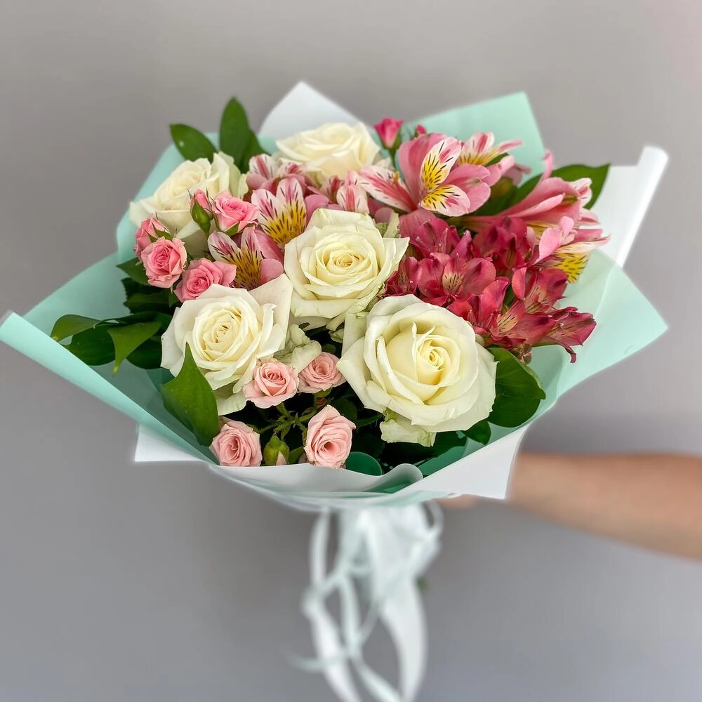 Утончённая композиция из классических роз, пышных кустовых роз и нежных альстромерий создаёт атмосферу элегантности. Идеальный выбор для особых моментов. Заказать букет цветов с доставкой на дом.