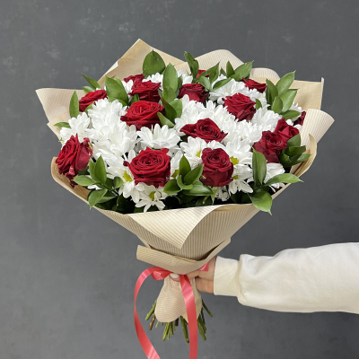 Букет «Романтика» — гармония красных роз и белоснежных хризантем