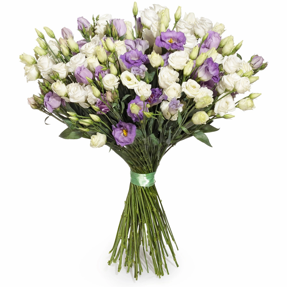 Утонченная композиция из белоснежных и фиолетовых эустом — воплощение элегантности и таинственности.