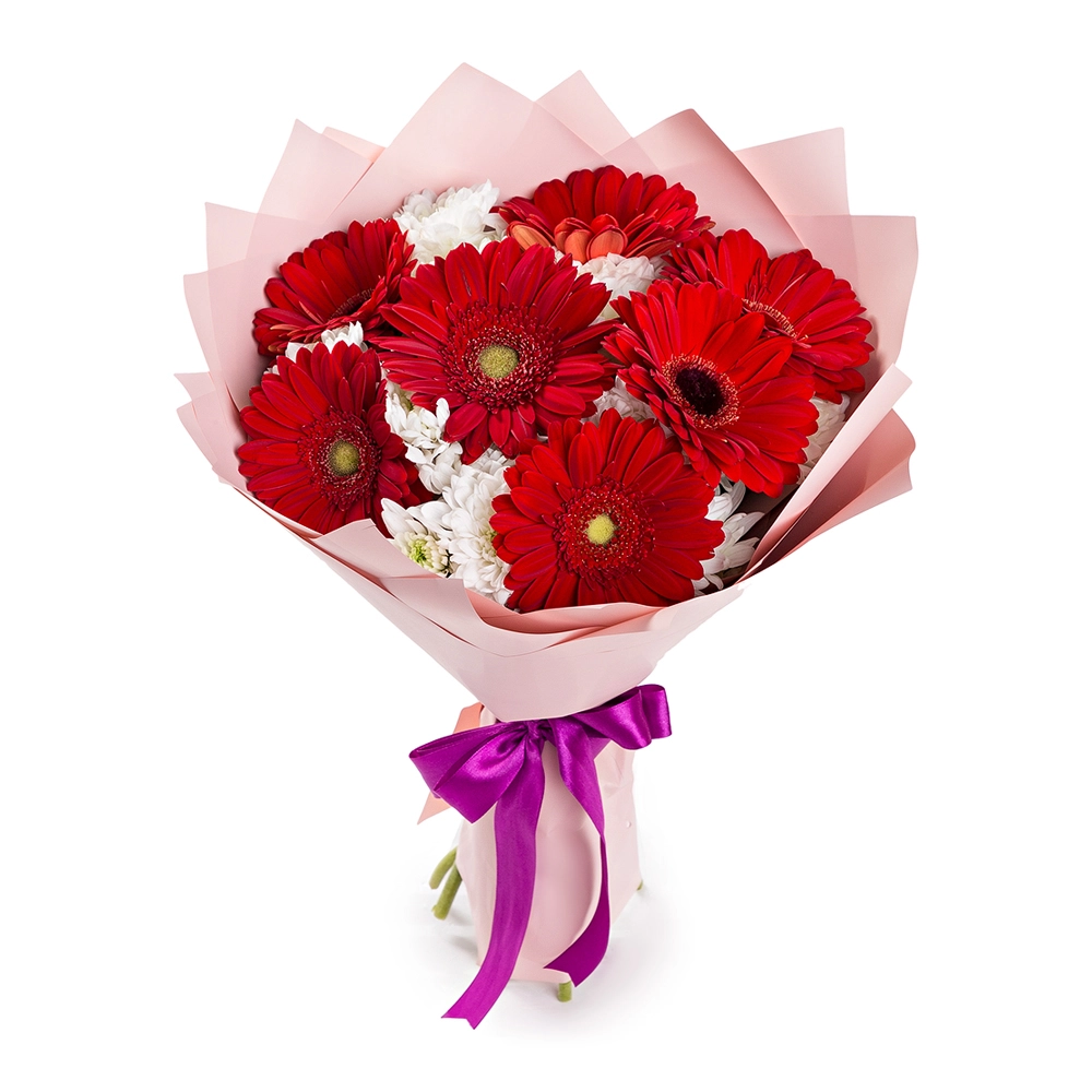 Яркая композиция из 7 сочных гербер и 4 белоснежных хризантем – идеальное сочетание энергии и нежности.
