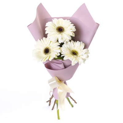 Элегантная композиция из 3 белоснежных гербер — идеальный выбор для романтического жеста или тёплого поздравления. Доставка цветов в день заказа.