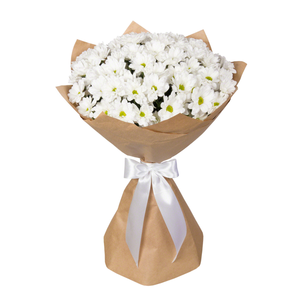 Пышный букет из 15 хризантем в крафт-бумаге – элегантность в каждом лепестке