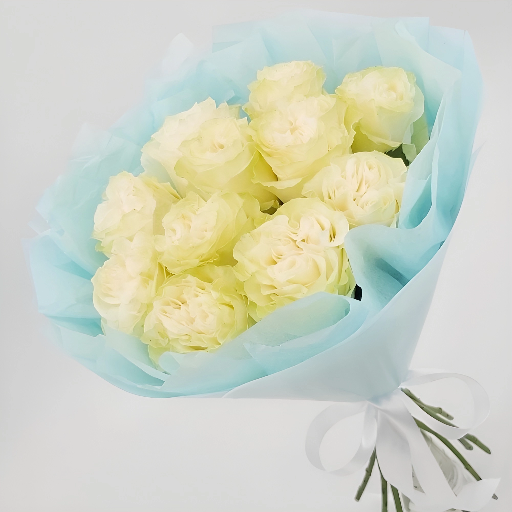 Воздушная композиция из 11 белоснежных эквадорских роз в обрамлении матовой плёнки и нежного тишью. Символ чистоты и невинности. Идеальный выбор для свадьбы, крещения или романтического признания. Заказать цветы с доставкой на дом Вытегра.