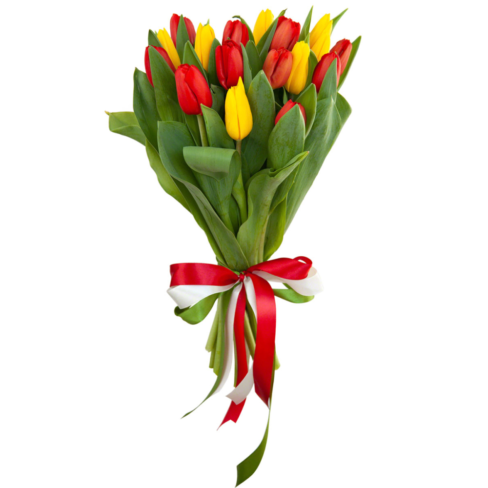 Букет «Краски весны» из 15 красных и жёлтых тюльпанов